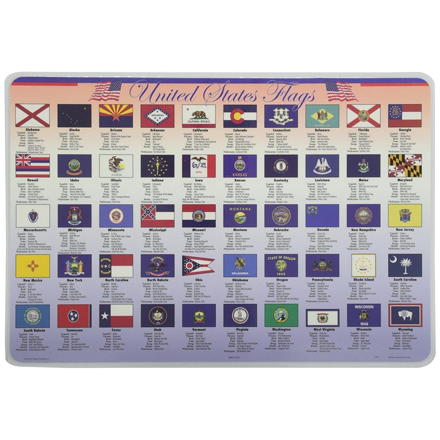 A delightful way for children to master new subjects and for adults to brush up on old ones! The front of the placemat is brightly colored, and laminated with a non-glare laminate. It features the flags of the 50 states of the US. The black & white back features the flags without identification, so children can fill in the correct information under each picture with a wipe-off marker. Laminated surface wipes clean with a damp cloth. 17-1/2 x 12".
