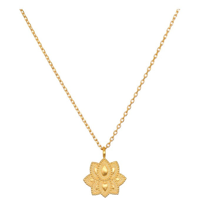 An 18kt gold plate lotus pendant necklace shines with intricate detail.