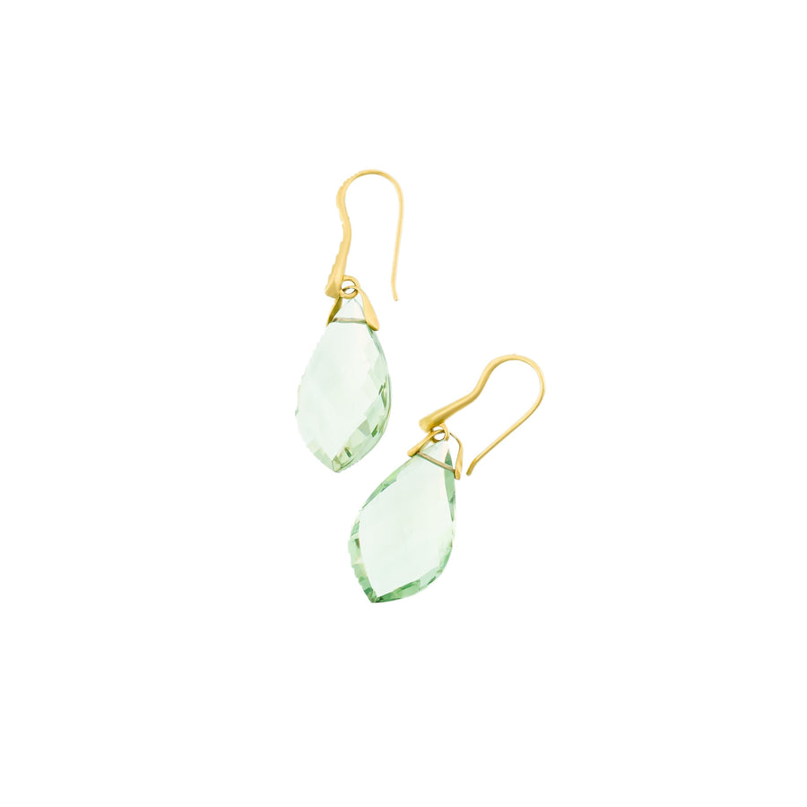 A checkerboard faceting pattern on both sides of this flattened briolette allows these prasiolite earrings to dance with sparkling light as light bounces around the interior of the gems. Prasiolite is the green cousin to Amethyst.