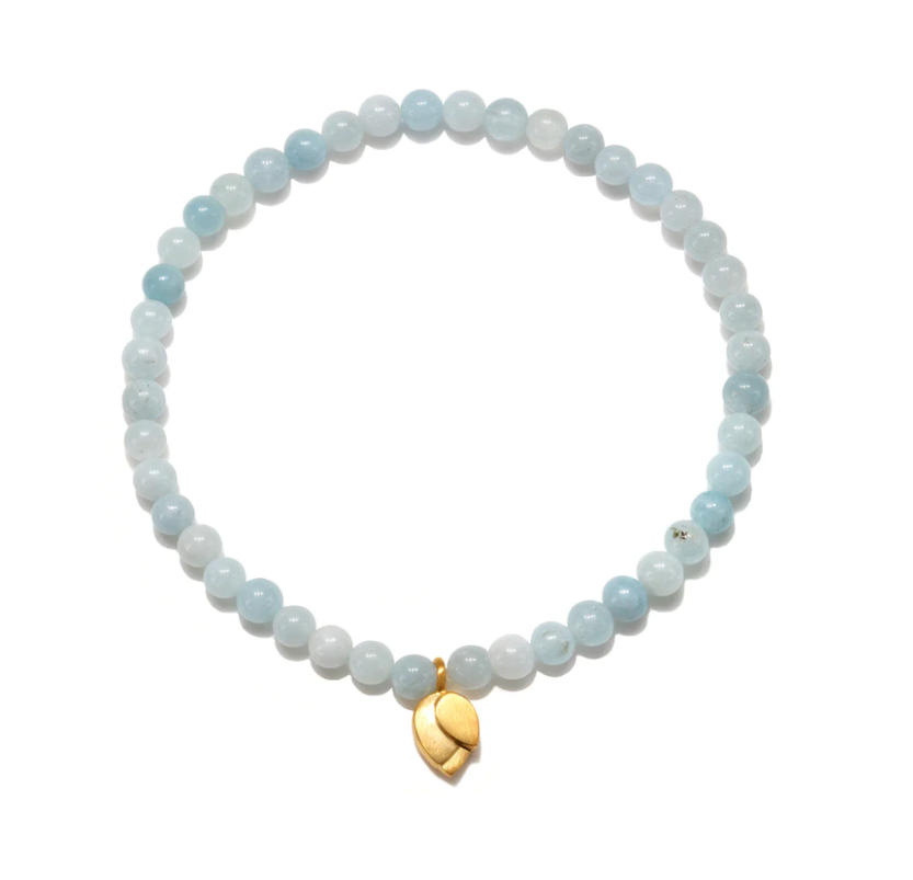 A stretch bracelet of aquamarine is accented by an 18kt gold plated lotus flower.