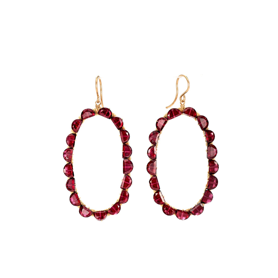 Half-moon red Garnets fill the 14k gold fill wire frame of these oval hoop earrings, giving them a whimsical border.