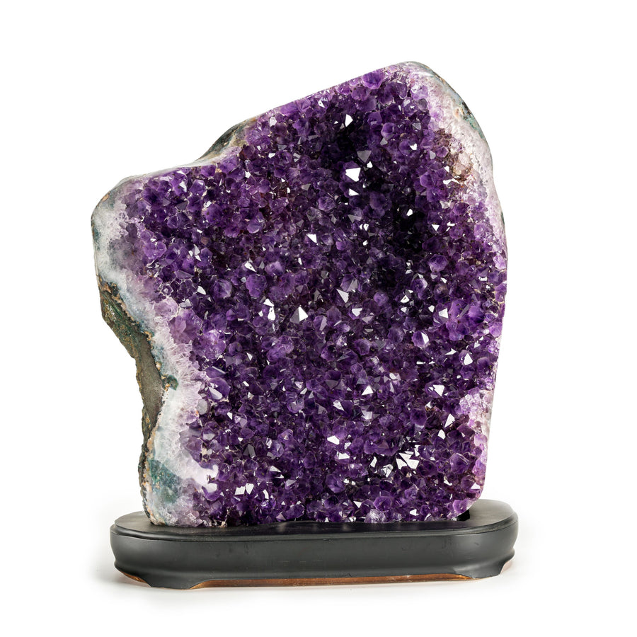 This Amethyst Cluster Geode sits on a wooden stand is is 19.2 inches tall. This item is Pickup Only from the Hermann Park museum location. For local delivery, please inquire via chatbox.