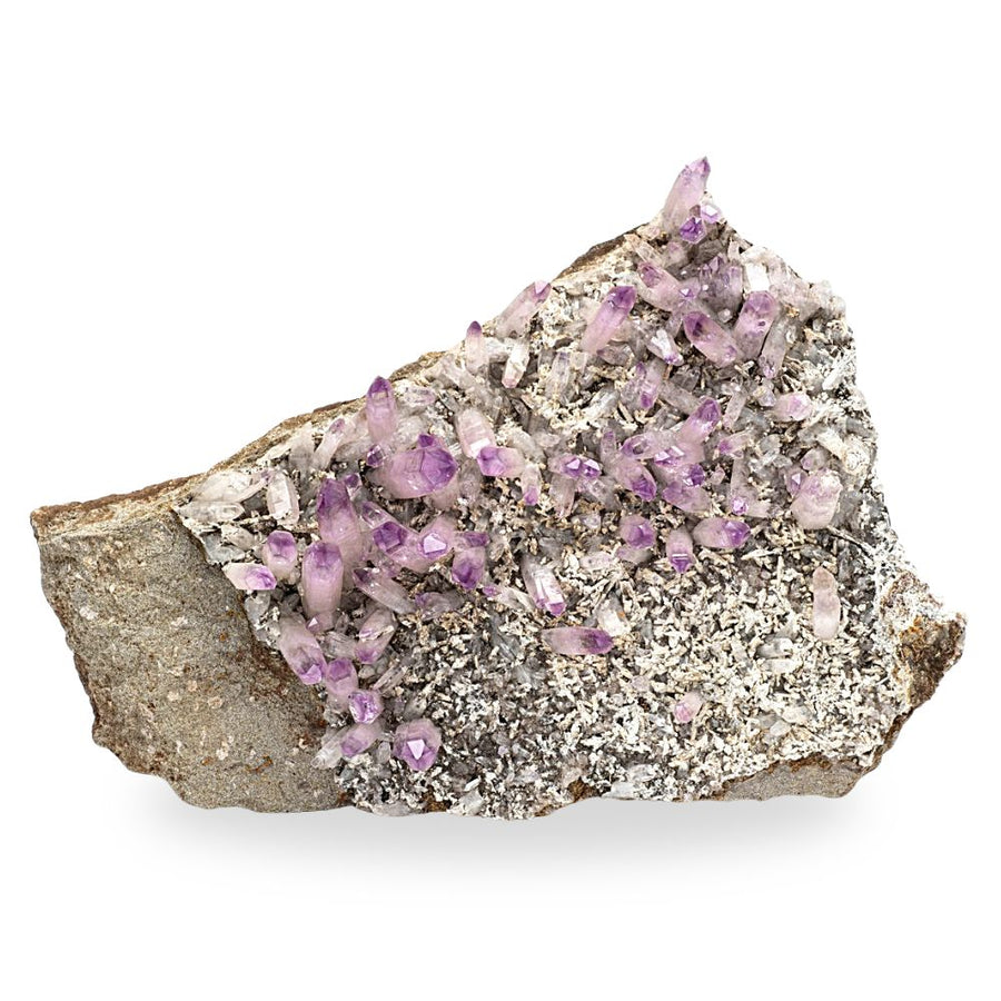 Viva Las Vigas! Amethysts from Las Vigas in Veracruz, Mexico are a true challenge to recover from the earth. Not only does the process begin with a six-hour mule ride in one direction, the path takes miners to the steep volcanic valleys of Cerro Piedra Parada. Rife with quartz veins, the miners follow the veins to where they widen out to crystal-lined pockets of amethyst. The finest Las Vigas Amethyst specimens feature slender, elongated prismatic crystals with colorless bases and transition to lavender or lilac towards their terminations.
