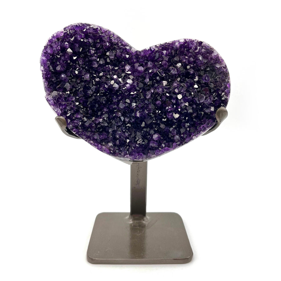 Amethysts are the most valuable variety of quartz, and were one of the first gemstones used by people around the world. The Greeks believed that drinking wine from an amethyst cup would prevent intoxication. Royalty has also favored the purple gemstone, and at one time amethysts were reserved for royalty alone. The rich purple color is due to iron and manganese inclusions. Exposure to heat or irradiation can produce a yellow to orange color (citrine) or a pale green color (prasiolite). The hexagonal crystal structure can vary in size from microcrystalline drusy to large scepters and often forms inside agate geodes. South Brazil is rich in minerals found in its mountainous basalt rock formations.