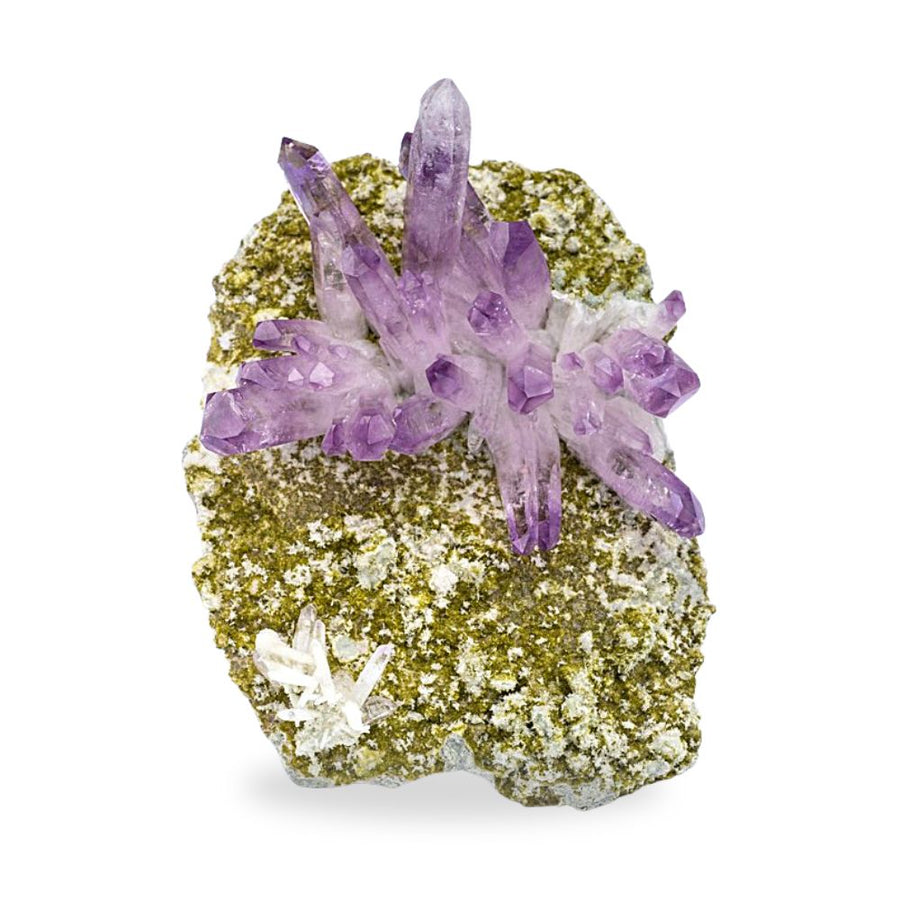 The rich purple color is due to iron and manganese inclusions. Exposure to heat or irradiation can produce a yellow to orange color (citrine) or a pale green color (prasiolite). The hexagonal crystal structure can vary in size from microcrystalline drusy to large scepters and often forms inside agate geodes.