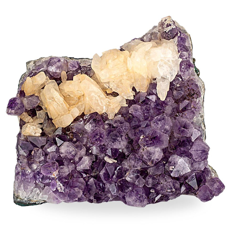 Calcite is an abundant mineral found around the world, but it's appearance amongst other crystals can create a visually stunning specimen. Seen in this Amethyst Geode, the Calcite crystals have a contrasting pastel orange shade, allowing them to "pop" amongst the rich purple Amethyst crystals.