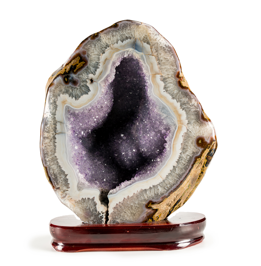 Eons ago, as 2400 degree Fahrenheit magma cooled, pockets of gas became trapped in the magma. The pockets of gas later became hollow cavities in the solid, newly formed basalt rock. These hollow cavities became filled with super-hot mineral-laden ground water which resulted in layers of agate and quartz crystals forming inside. Miners in Brazil use hand tools to extract agate geodes from eroded mountain sides. For generations Brazilian miners have learned to cut the geodes in half, polish the cut surface, sides and some of the backs. The miners sell the worked geodes to collectors who enjoy their beauty and wonder.