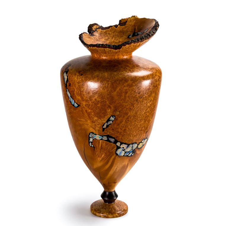 To Shanti Yard, the role of the woodworker is simply to know what to look for, how to look for it, and how to work with the wood’s innate patterns and characteristics. This alone is the work of a lifetime, just as the tree’s self-creation was a work of its lifetime. Once the tree’s life has run its course, fungi take over the art canvas. Mycelium runs through the inner workings of the wood, creating a new color and tone. With each piece, Yard imagines what shape lies within, taking in how the grain flows and what angles already exist in the log. Each chip, chisel, and scrape alters the wood irrevocably, so each action must be a conscious choice