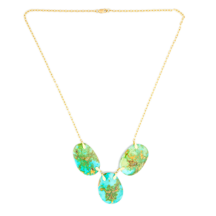 This necklace is proudly featured in HMNS' Element Publication! Composed of Arizona Turquoise that is veined with beautiful sky blue, rich green, and earthy golden hues of the turquoise's matrix. Reversible to display two unique patterns of the gems, this necklace is stunning and feels very luxurious against the skin. 19" length