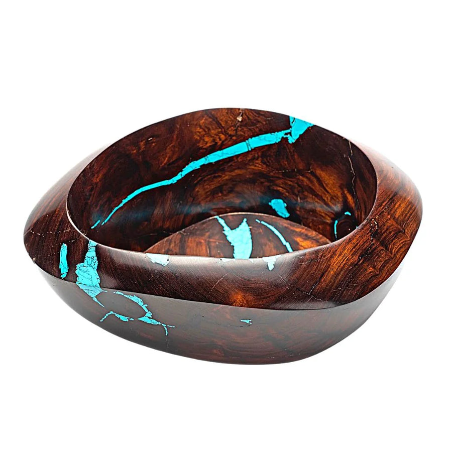 Artist Larry Favorite was a mechanical engineer on the fast track for success in the business world back in the early 1970s when he decided to leave his business career to pursue a growing interest in art. Forty five years later, Favorite continues to work exclusively with desert ironwood which is only found in the Sonoran Desert in the American southwest. Some of this rare wood has lain dead in the desert between 200 and 1,500 years. Favorite inlays ironwood turquoise into the wood as seen in this exquisite piece.