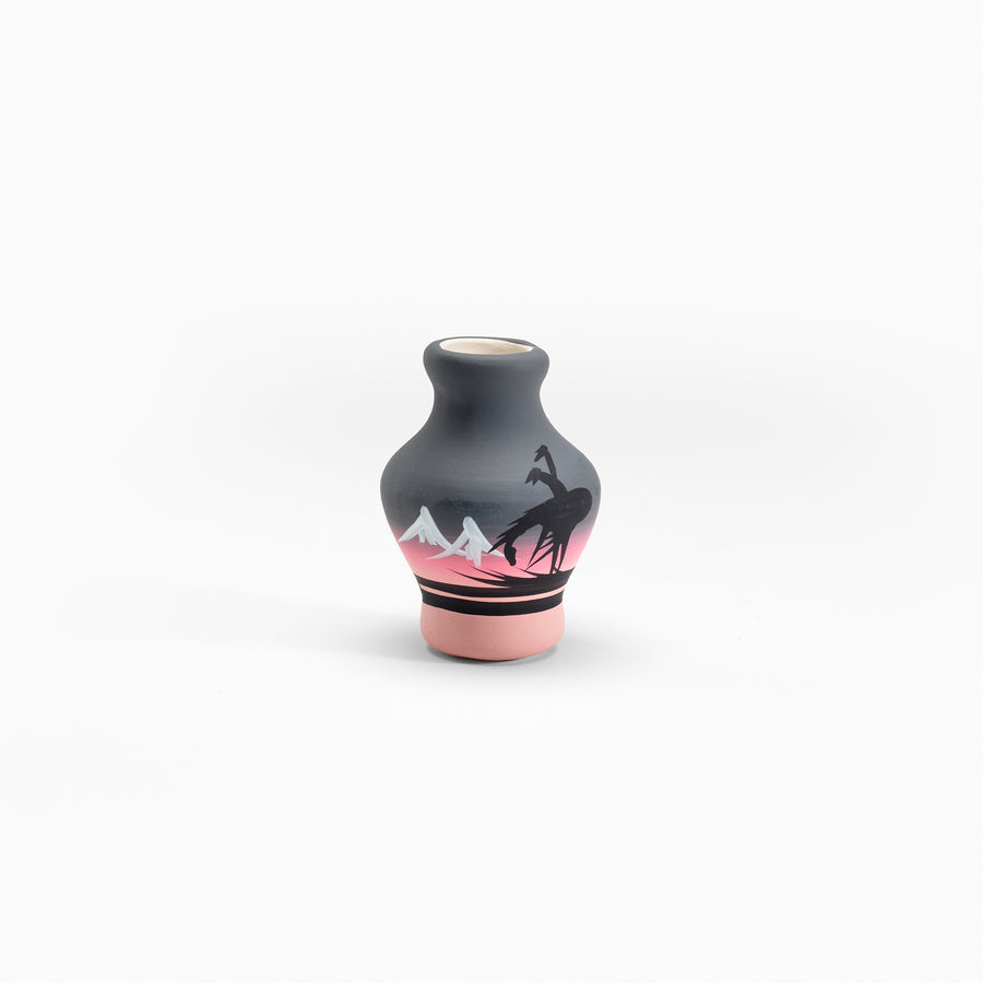 This Pottery piece depicts the End of the Trail motif that stems from a sculpture by James Earle Fraser in 1894. It depicts a weary Native American man, hanging limp from his weary horse as the wind blows through the tall grass and their hair. Despite the images appeal as a popular American icon, Fraser intended the work as a pointed commentary on the damaging effects of Euro-American settlement. The sculpture continues to resonate with audiences in the twenty-first century, taking on new meanings and new forms in the digital age.