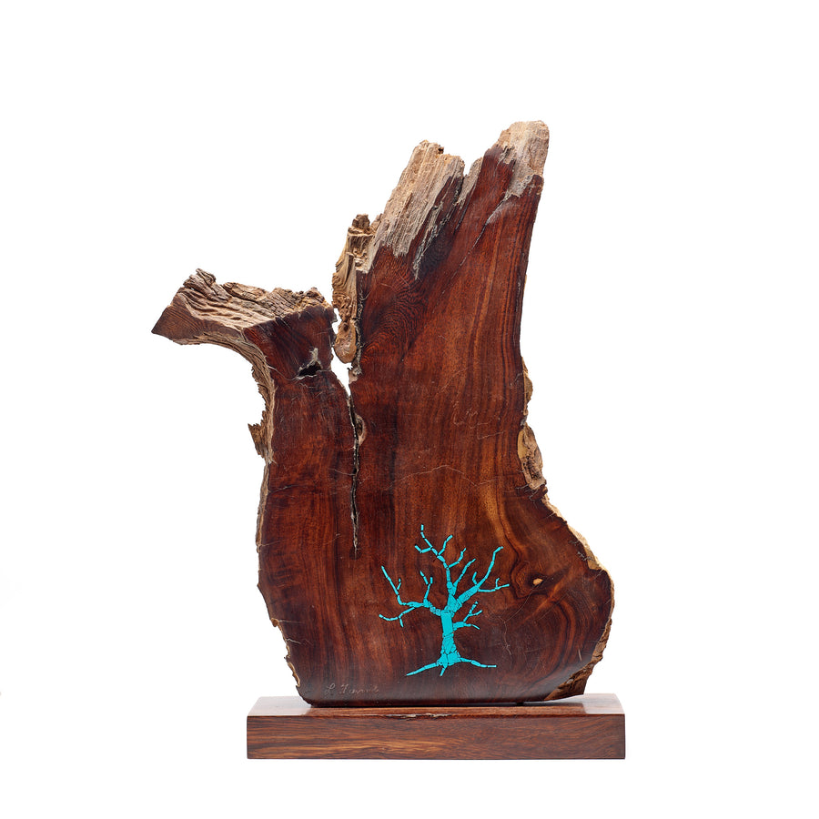 Artist Larry Favorite was a mechanical engineer on the fast track for success in the business world back in the early 1970s when he decided to leave his business career to pursue a growing interest in art. Forty five years later, Favorite continues to work exclusively with desert ironwood which is only found in the Sonoran Desert in the American southwest. Some of this rare wood has lain dead in the desert between 200 and 1,500 years. Favorite inlays turquoise into the wood as seen in this exquisite piece.