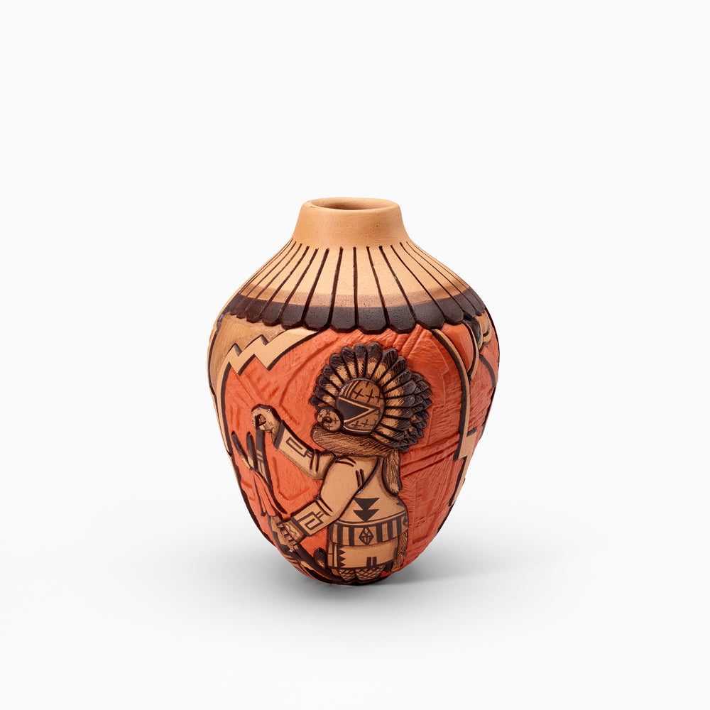 Marty Naha Nampeyo is known together with his wife for their development of the incised redware (introduced by Elvira's father, Tom Polacca), Marty and Elvira have nearly perfected the Kachina element captured in each of their unique pieces.