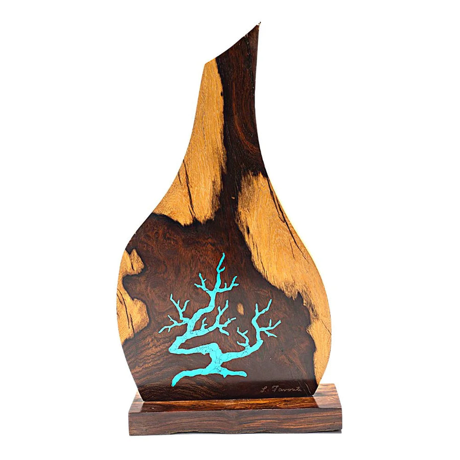 Artist Larry Favorite was a mechanical engineer on the fast track for success in the business world back in the early 1970s when he decided to leave his business career to pursue a growing interest in art. Forty five years later, Favorite continues to work exclusively with desert ironwood which is only found in the Sonoran Desert in the American southwest. Some of this rare wood has lain dead in the desert between 200 and 1,500 years. Favorite inlays turquoise into the wood as seen in this exquisite piece.
