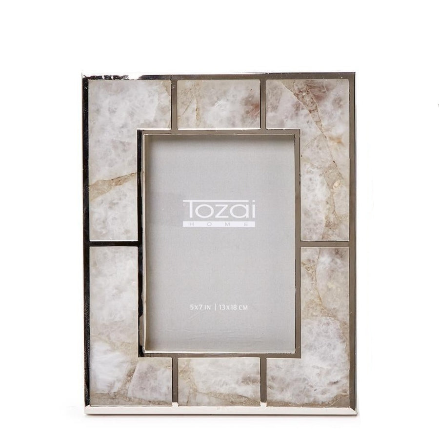 These Contemporary solid stone quartz frames are highlighted and accented with fretwork in a silver metal. The neutrality allows the frames to be placed in just about any home.