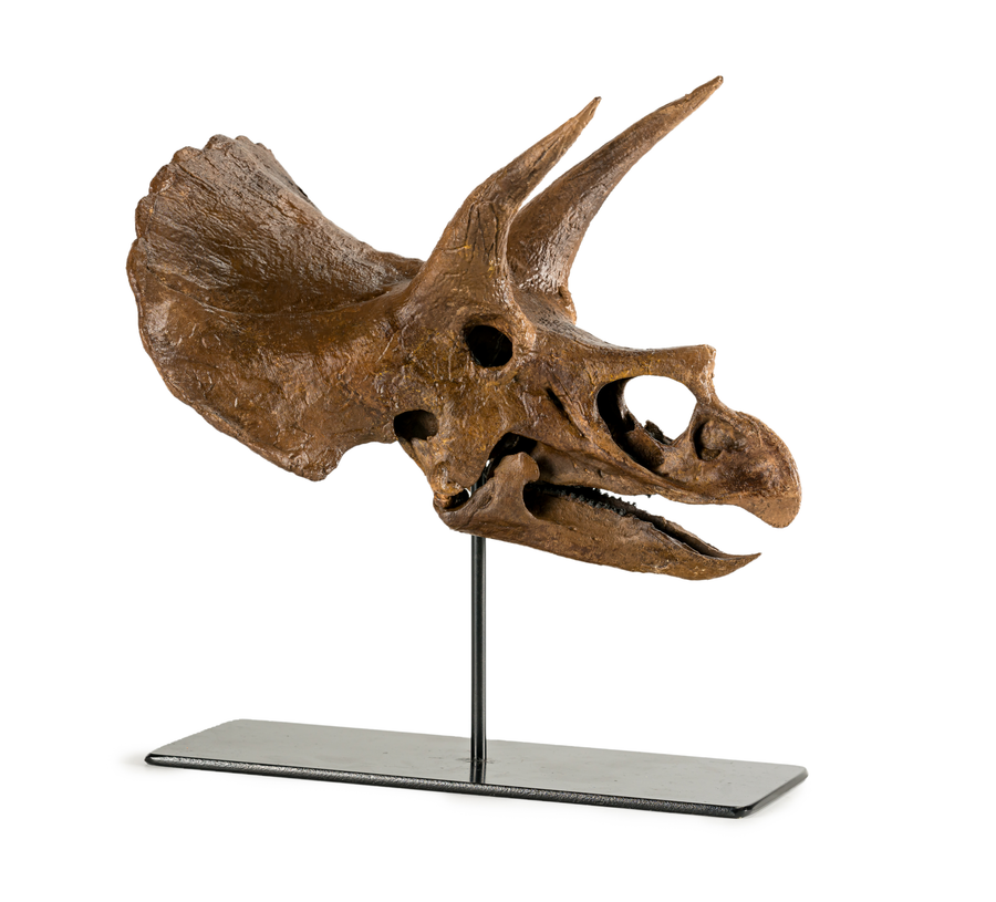 This herbivore may have had a dual use for its three horns and large bony frill. Undoubtedly helpful in protecting the animal from its predators like T. rex, Triceratops' horns may also have been used for uprooting trees, and its frill for extra protection as the trees fell. Its powerful jaws and very coarse teeth would then vertically slice and powerfully pulverize, whole trees.