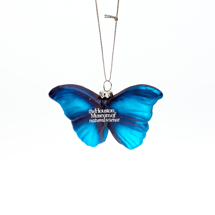 Forget snow, let it rain butterflies instead! Keep the spirit merry and bright all year 'round with the Blue Morpho HMNS Butterfly Ornament! This bold ornament is blown-glass and bears the museum's name on it. Hints of glitter on its back help it shimmer and glow on your tree for the holiday season.
