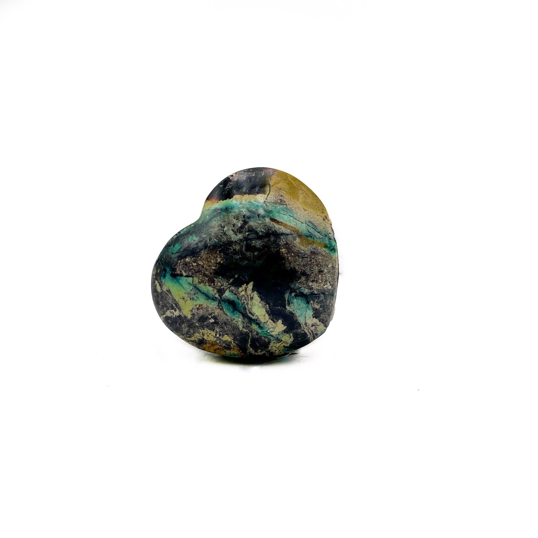 These are gorgeous, hand-polished hearts made from brilliant sky-blue chrysocolla and chalcedony, collected from Indonesia. The lapidary work is very nice and allows for the natural formations of the mineral to be seen.