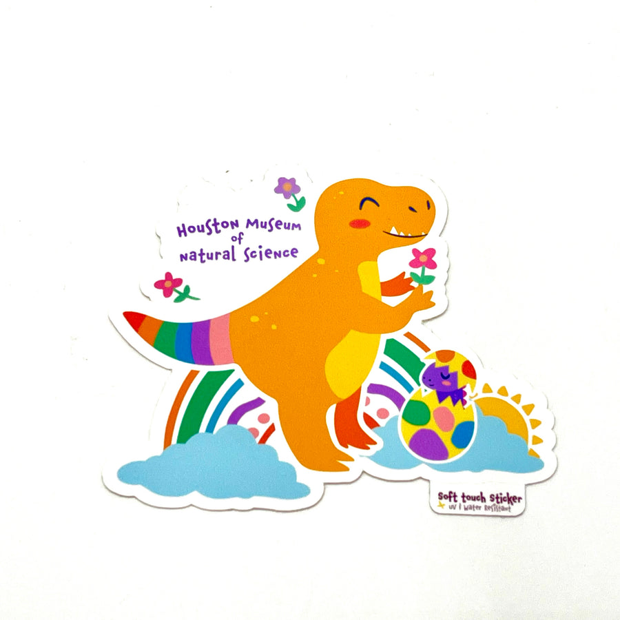 Jazz up your things with our HMNS Rainbow T. rex Sticker! This fun and colorful sticker features a cute cartoon dinosaur with a vibrant rainbow tail and background. Perfect for decorating water bottles, laptops, and more, it will add a playful touch to your belongings.