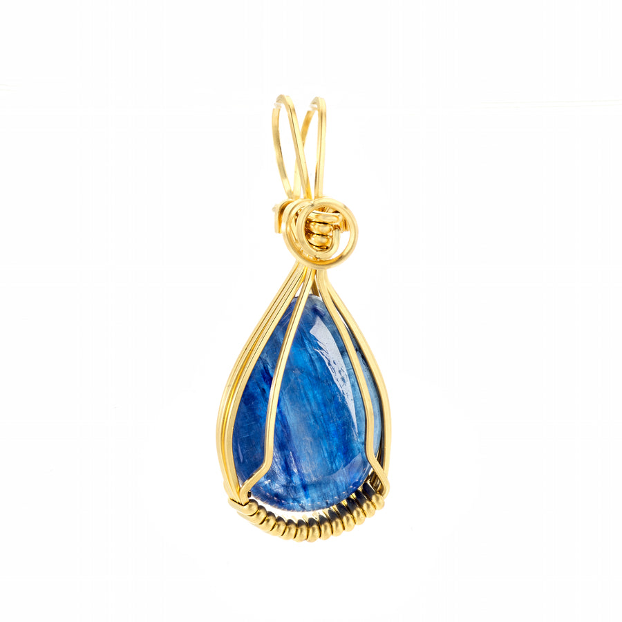 Gold pendant with a teardrop-shaped blue gemstone on a white background