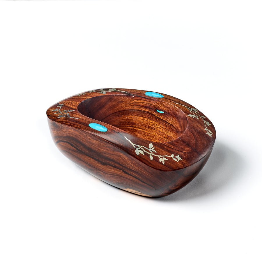 Ironwood Bowl with Turquoise Cabochon and Silver Vines