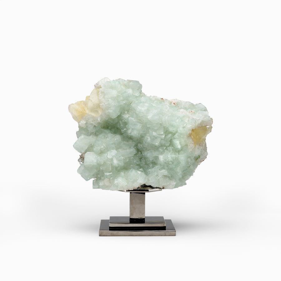 Featuring colorless to pastel mint to apple green, the semi-translucent pseudo-cubic crystals of Apophyllite are intergrown and stacked on each other. Two clusters of peachy Calcite crystals balance the piece on each side of the Apophyllite specimen.