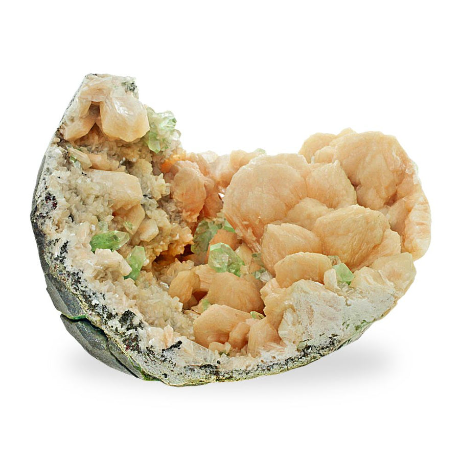 Finally, a fruit salad mix that thinks outside of the rind. This “fruit bowl” features cantaloupe-hued cluster of Stilbite, and gemmy, green honeydew Apophyllite crystals. This basaltic vug features various melon-hued crystals- and is roughly the size of a melon as well- lining the inside of the matrix rind. The peachy orange and minty green shades provide stunning pastel contrast against one another and creating a pleasant specimen to add to your mineral collection or home décor. This Apophyllite and Stilbite Cluster is 7" in diameter.