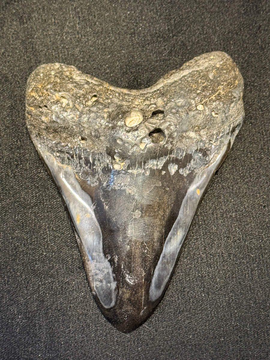 Averaging from 40-60ft long as a species, the Megalodon was a behemoth that ruled the ancient oceans until it vanished 3.6 million years ago. Now, only their teeth remain deep below the sea and in dangerous riverbeds. These Megalodon Teeth hail from the rivers of the Carolina's, rife with rapids and alligators under the murky water. After being recovered by ex-Navy divers, the teeth undergo cleaning and slight polishing, mostly to remove rock and barnacles from the teeth. The dark coloring often found in these teeth is due to the fossilization process, permineralization. Water seeps through the sediment the tooth is buried in, and carries the minerals from the sediment into the pore spaces in the tooth.