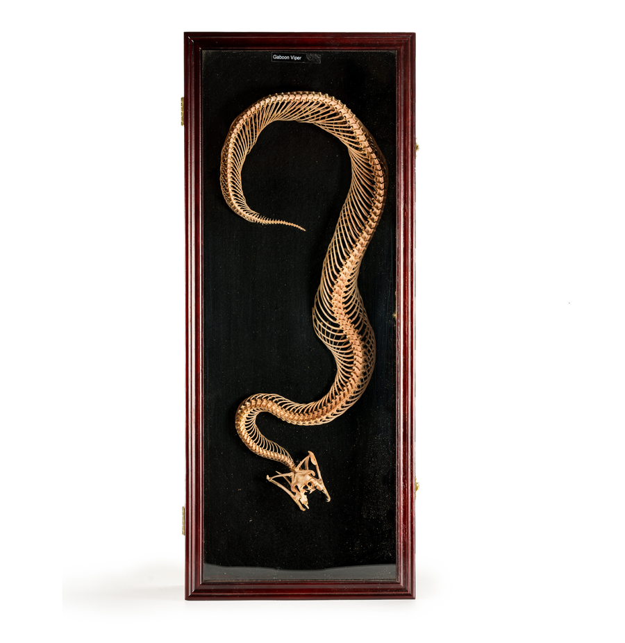 Nocturnal, Gaboon Vipers are known for being slow-moving and placid. They ambush hunt their prey, often spending long periods of time motionless. They are usually a very tolerant snake when handled, and rarely bite or hiss. Because of this, bites from Gaboon Vipers are very rare, usually only occurring when a human accidentally steps on them.