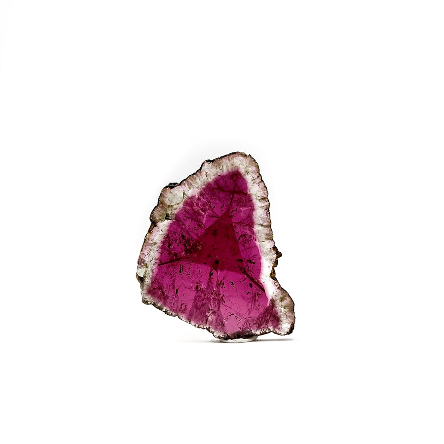 A stunning cross-section of a Rubellite Tourmaline crystal from Russia, the focus of this translucent slice is the triangular magenta core and its distinct "arms" extending to the clear Tourmaline layer. A thin layer of green Tourmaline forms the rim of this specimen, mimicking a slice of watermelon. This Tourmaline cross-section has been polished to a glassy finish on both sides.