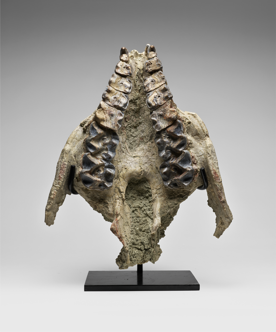 | Titanotheres (or Brontotheres) were massive mammals that looked similar to modern rhinos, but were closely related to horses. Titanotheres lived during the Eocene (56-34 million years ago), after the mass extinction event that wiped out dinosaurs. When Sioux tribes found Titanothere fossils, they named the creatures "thunder beasts"--a very accurate name, as Titanotheres were the largest creatures on land after the fall of dinosaurs. Interestingly, a Titanothere jaw was the first fossil from the White River Badlands to be described in a scientific journal in the mid-1800s, prompting paleontological study that has continued there through present day. This specimen was professionally excavated and prepared by the Black Hills Institute of Geological Research in South Dakota. 15 x 9 x 20 inches. |