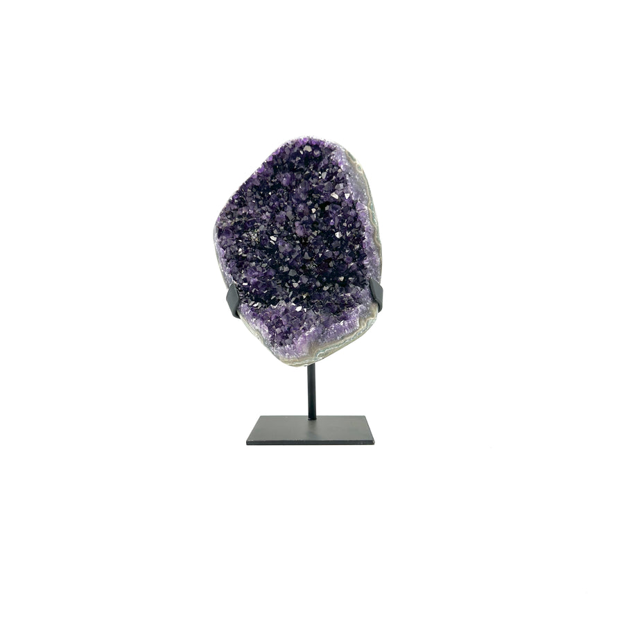 Amethysts are the most valuable variety of quartz, and were one of the first gemstones used by people around the world. The Greeks believed that drinking wine from an amethyst cup would prevent intoxication. Royalty has also favored the purple gemstone, and at one time amethysts were reserved for royalty alone. The rich purple color is due to iron and manganese inclusions. Exposure to heat or irradiation can produce a yellow to orange color (citrine) or a pale green color (prasiolite). The hexagonal crystal structure can vary in size from microcrystalline drusy to large scepters and often forms inside agate geodes. South Brazil is rich in minerals found in its mountainous basalt rock formations.