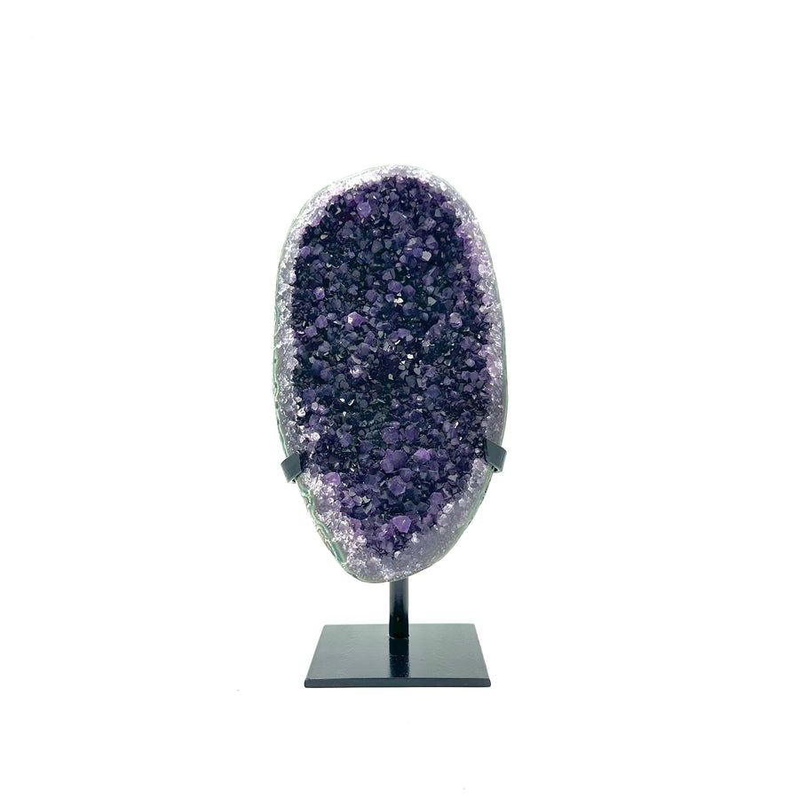 Amethysts are the most valuable variety of quartz, and were one of the first gemstones used by people around the world. The Greeks believed that drinking wine from an amethyst cup would prevent intoxication. Royalty has also favored the purple gemstone, and at one time amethysts were reserved for royalty alone. The rich purple color is due to iron and manganese inclusions. Exposure to heat or irradiation can produce a yellow to orange color (citrine) or a pale green color (prasiolite). The hexagonal crystal structure can vary in size from microcrystalline drusy to large scepters and often forms inside agate geodes. South Brazil is rich in minerals found in its mountainous basalt rock formations.