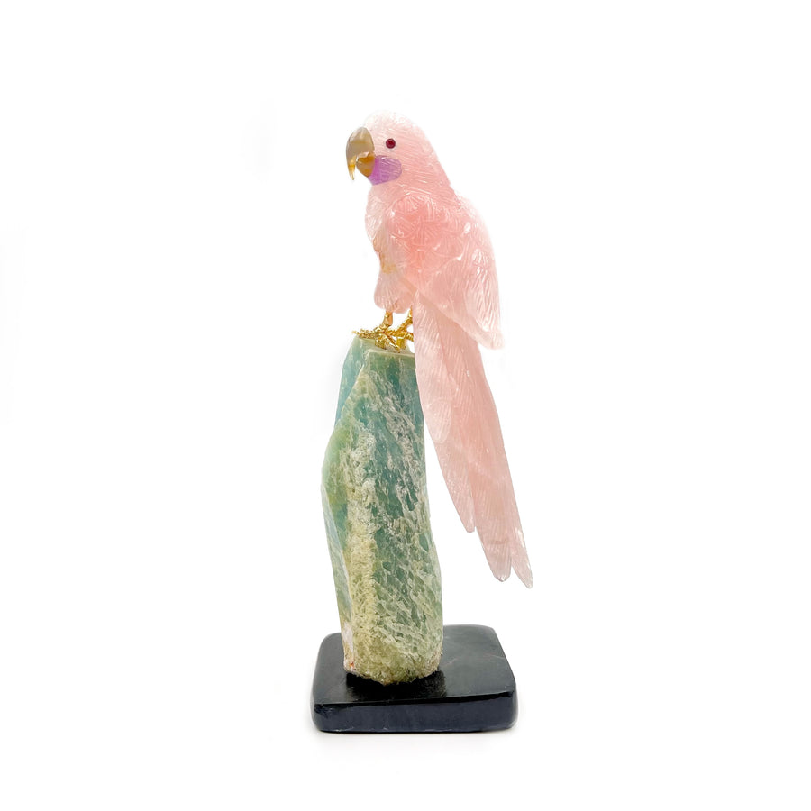 Rose Quartz Macaw on Aquamarine Bird Carving