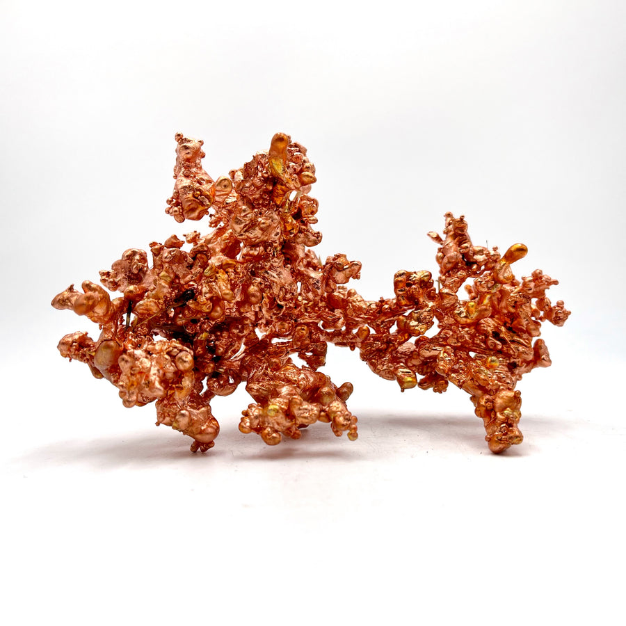 In order to create these abstract forms, molten copper at 2200° F is poured over water-soaked straw. Due to the high temperature, the straw burns away as the water cools and solidifies the element into these unique shapes. Whether displayed as a showpiece on a bookshelf, décor upon a desk, or the centerpiece of a coffee table, these scientific sculptures are a one-of-a-kind conversation piece that is sure to catch the attention of anyone who comes across it.