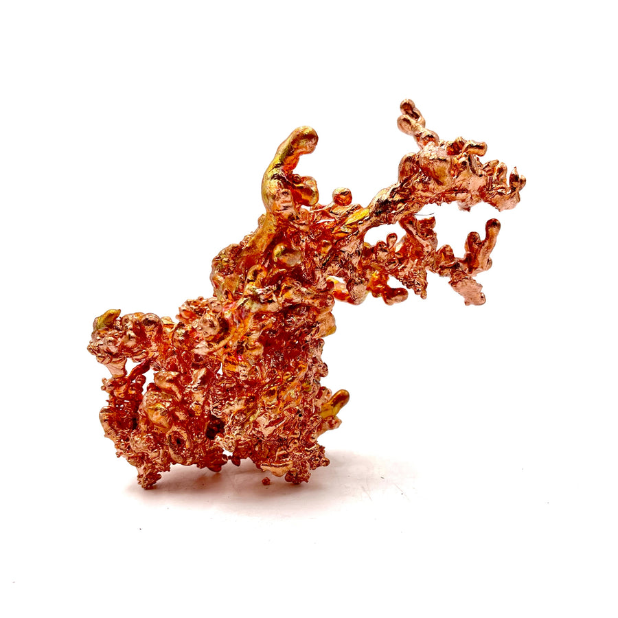 In order to create these abstract forms, molten copper at 2200° F is poured over water-soaked straw. Due to the high temperature, the straw burns away as the water cools and solidifies the element into these unique shapes. Whether displayed as a showpiece on a bookshelf, décor upon a desk, or the centerpiece of a coffee table, these scientific sculptures are a one-of-a-kind conversation piece that is sure to catch the attention of anyone who comes across it.