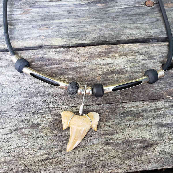 The tooth on this necklace comes from the Otodus Shark, which averaged around 30 feet and is a direct ancestor of the commonly known Megalodon! It hangs on a 18 inch rubber necklace with 1.5 inch extension. These teeth are 50 million years old and were collected in Morocco.