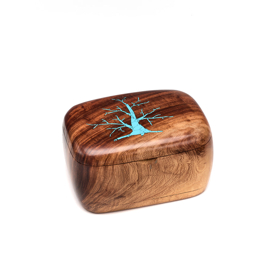 Artist Larry Favorite was a mechanical engineer on the fast track for success in the business world back in the early 1970s when he decided to leave his business career to pursue a growing interest in art. Forty five years later, Favorite continues to work exclusively with desert ironwood which is only found in the Sonoran Desert in the American southwest. Some of this rare wood has lain dead in the desert between 200 and 1,500 years. Favorite inlays turquoise into the wood as seen in this exquisite piece.