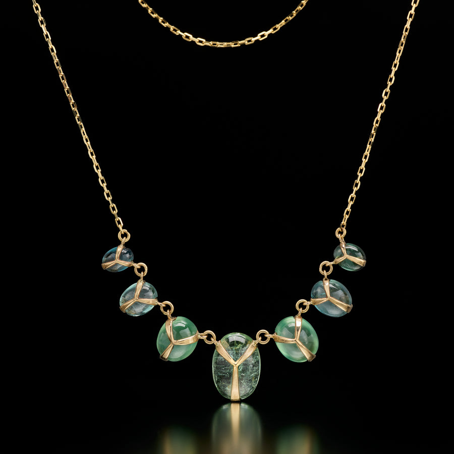 Inspired by the Egyptian scarab symbol, this vibrant necklace features carved green Tourmalines encased in 14k gold.