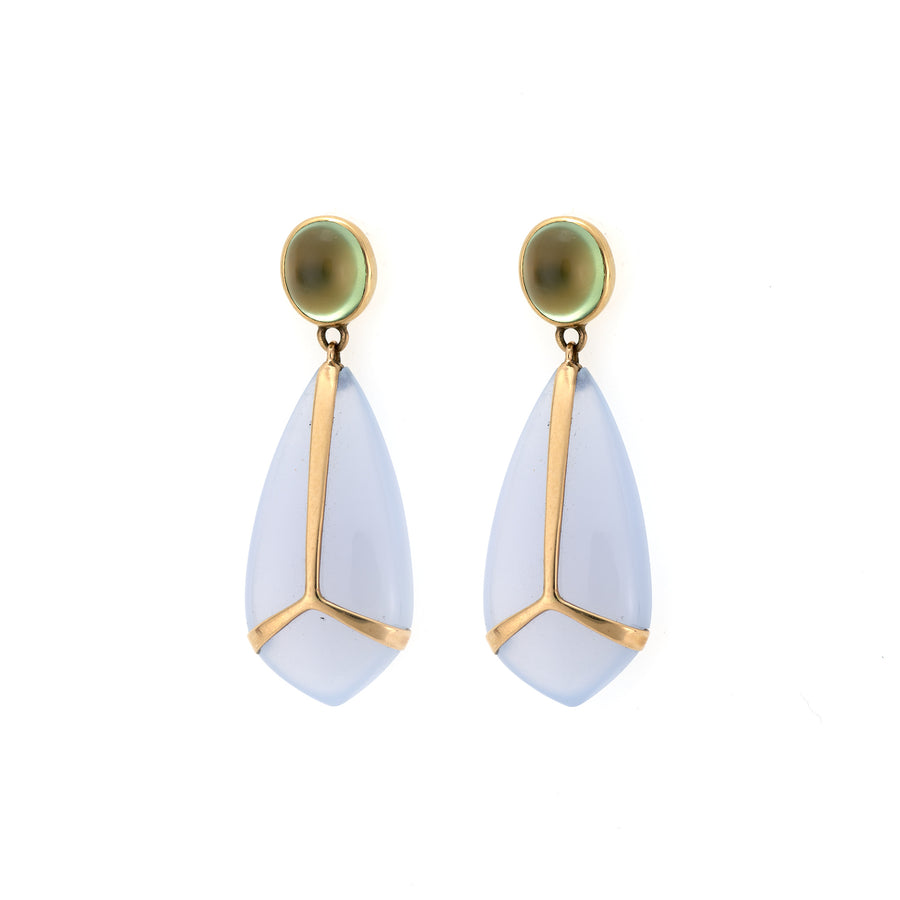 • Inspired by the Egyptian scarab symbol, these vibrant earrings features carved Prehnite and Chalcedony encased in 14k gold. These earrings, like all of her pieces, were created in Rachel Atherley's NY studio.