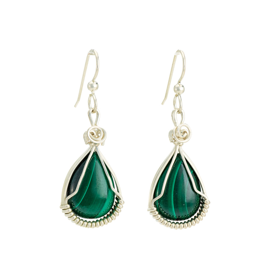 MALACHITE is a beautifully banded green stone. The malachite in this jewelry piece is from the Democratic Republic of Congo. The green color comes from its copper content. Malachite, like turquoise, is often discovered in copper mines.