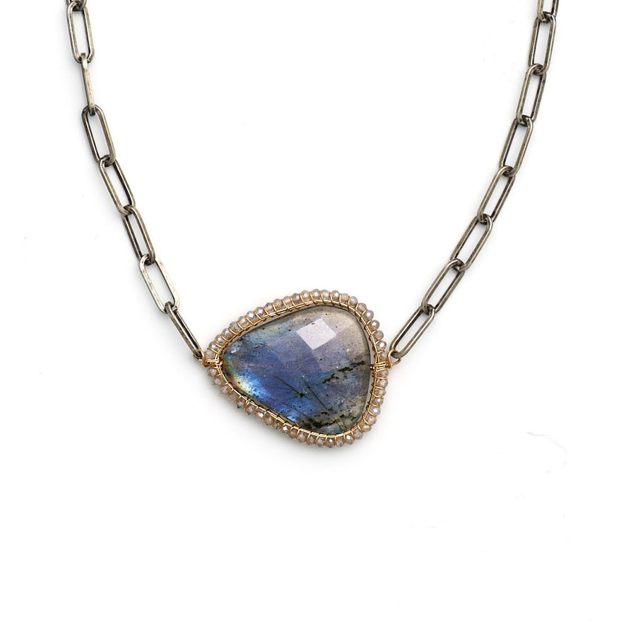 Why choose one color when you can have them all? The Labradorite Slice Necklace features a brilliant and flashy Labradorite slice with colors ranging from orange to peacock blue.