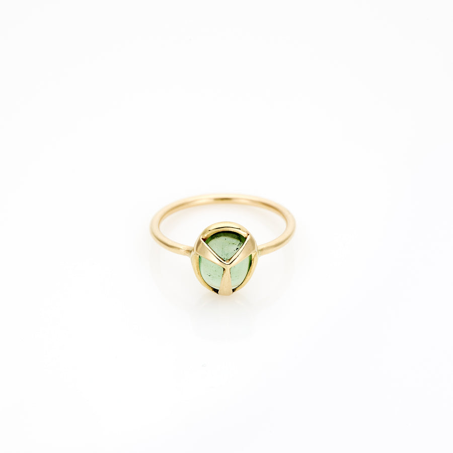 • Inspired by the Egyptian scarab symbol, this beautiful ring features a carved Green Tourmaline encased in 14k gold. This ring, like all of her pieces, was created in Rachel Atherley's NY studio.