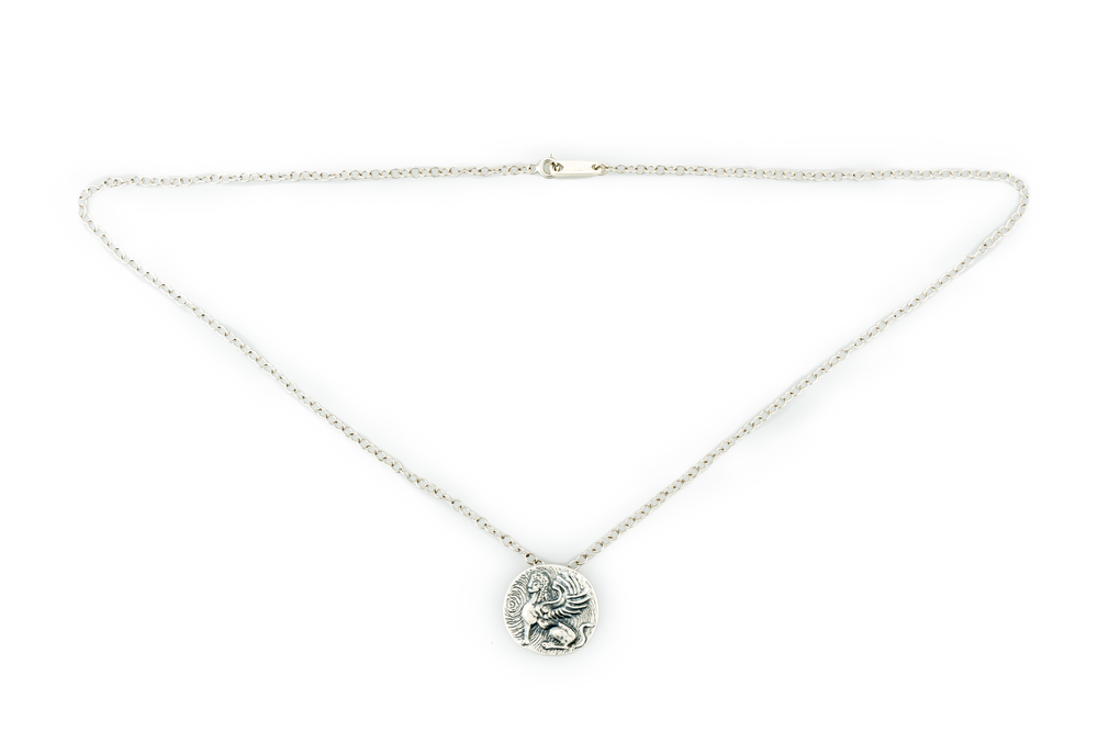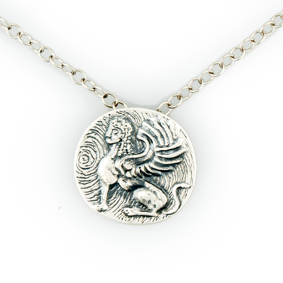 Inspired by the mythological creature the Sphinx in ancient Egypt and Greece mythology. Human head, wings of eagle, body of lion. The master model is hand engraved by Maria A. by the using the authentic ancient technique of coin manufacturing. Then the replicas are made by the traditional lost-wax technique.