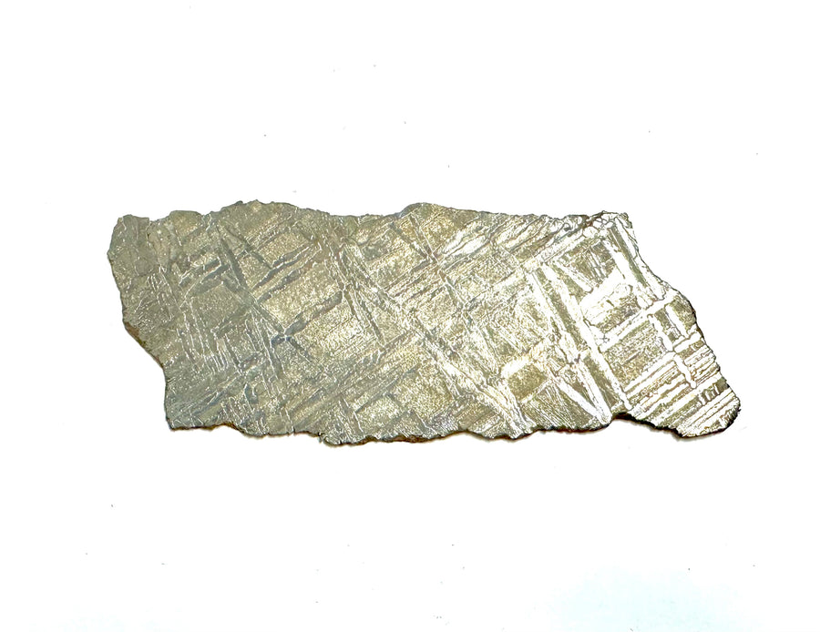 Discovered in the late 1960’s in a dry river bed near the settlement of Seymchan in the Magadan Oblast (district) of Russia, Seymchan meteorites possess resplendent crystalline patterns called Widmanstätten patterns. These are a result of the intergrowth of kamacite and taenite- two Iron-Nickle minerals. Pieces that don't contain these patterns often have brilliant leopard-like spots of olivine crystals. The Seymchan meteorite strewn field is now reportedly depleted.