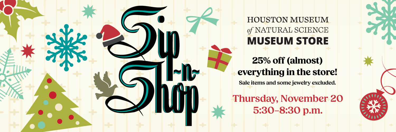 Sip~n~Shop is an afterhours shopping event hosted by the HMNS Museum Store before the Black Friday rush begins! Take advantage of our free gift wrapping station, sign up for giveaways, and treat yourself to something bubbly while shopping for the holiday season.