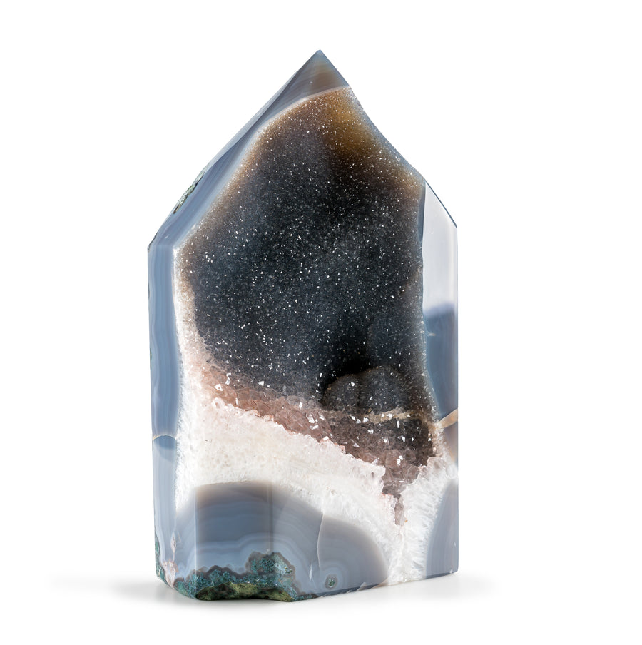 This Agate obelisk carving features grey, blue, and white banding with a druzy crystal façade.