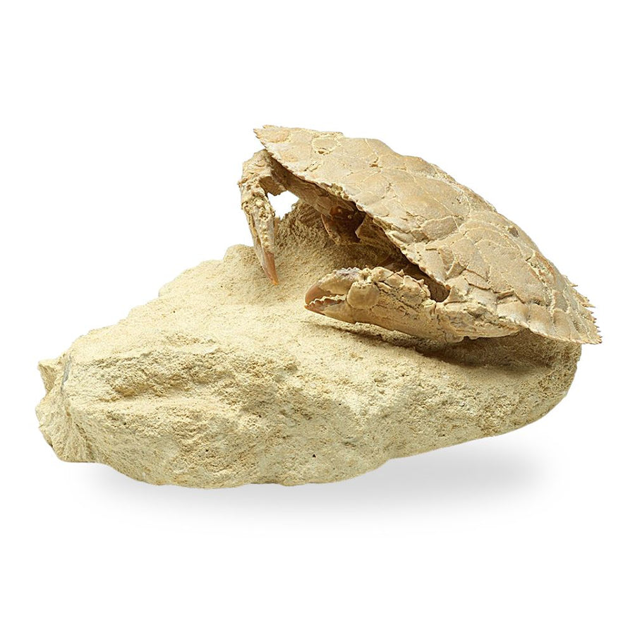 This fossilized crab has been artfully prepared to show the crab emerging from its sandstone matrix. Beautifully preserved, the crab’s legs and claws are in a lifelike position. The preparation of the fossil provides an unobstructed view of the crab’s carapace and belly as it bashfully covers its face with its front claws. While crabs are known in the fossil record as far back as the Jurassic Era, primitive crabs date as far back as the Carboniferous Era, 350 million years ago. The three-dimensionality of this fossil is superb, allowing it to be displayed at a variety of angles.