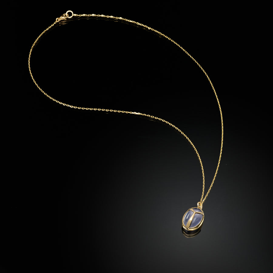- Inspired by the Egyptian scarab symbol, this necklace features a carved Chalcedony cabochon encased in 14k gold. This necklace, like all of her pieces, was created in Rachel Atherley's NY studio.